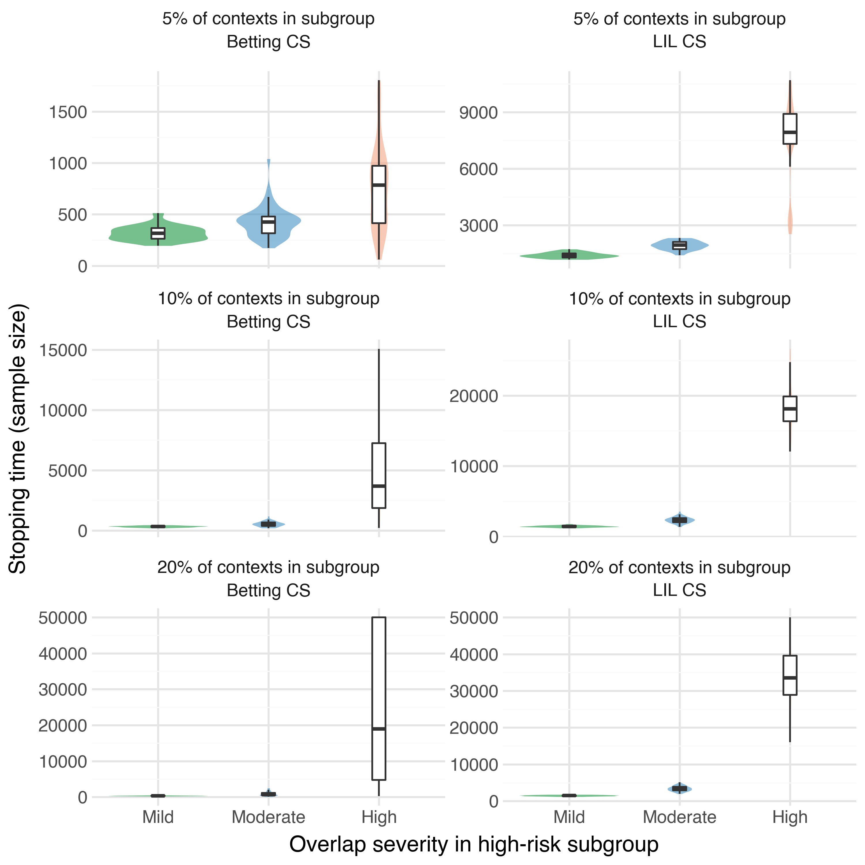 What it shows: How weak overlap between the logging policy \(h\) and a target policy \(\pi\) in a subset of the covariate space can inflate the stopping time. We plot the empirical distribution of stopping time under both types of CSs across a grid of increasing weak overlap severity. As expected, we see that the sample requirements for identifying \(\pi^*\) increase tremendously under significant weak overlap.