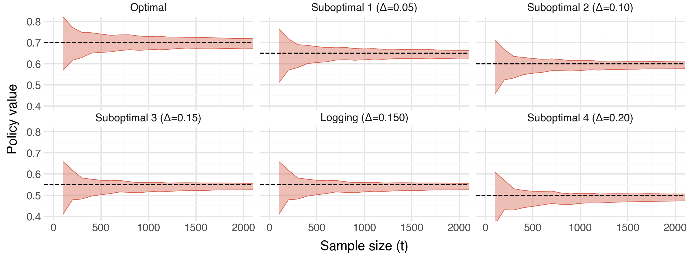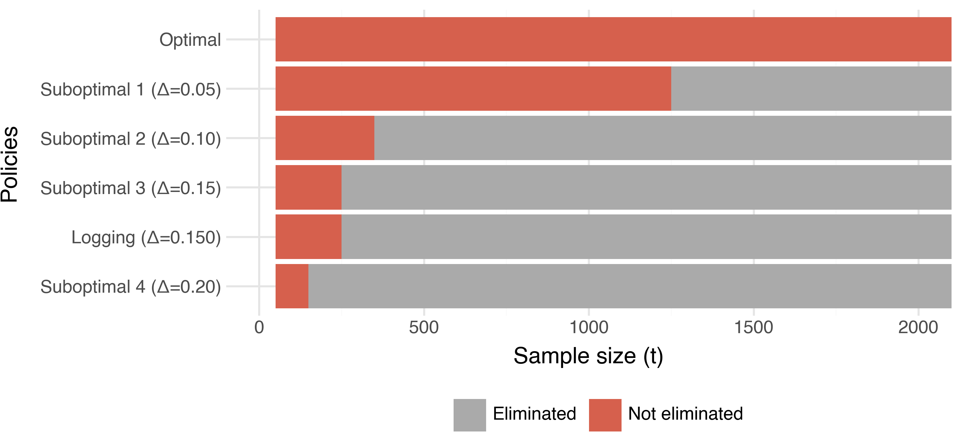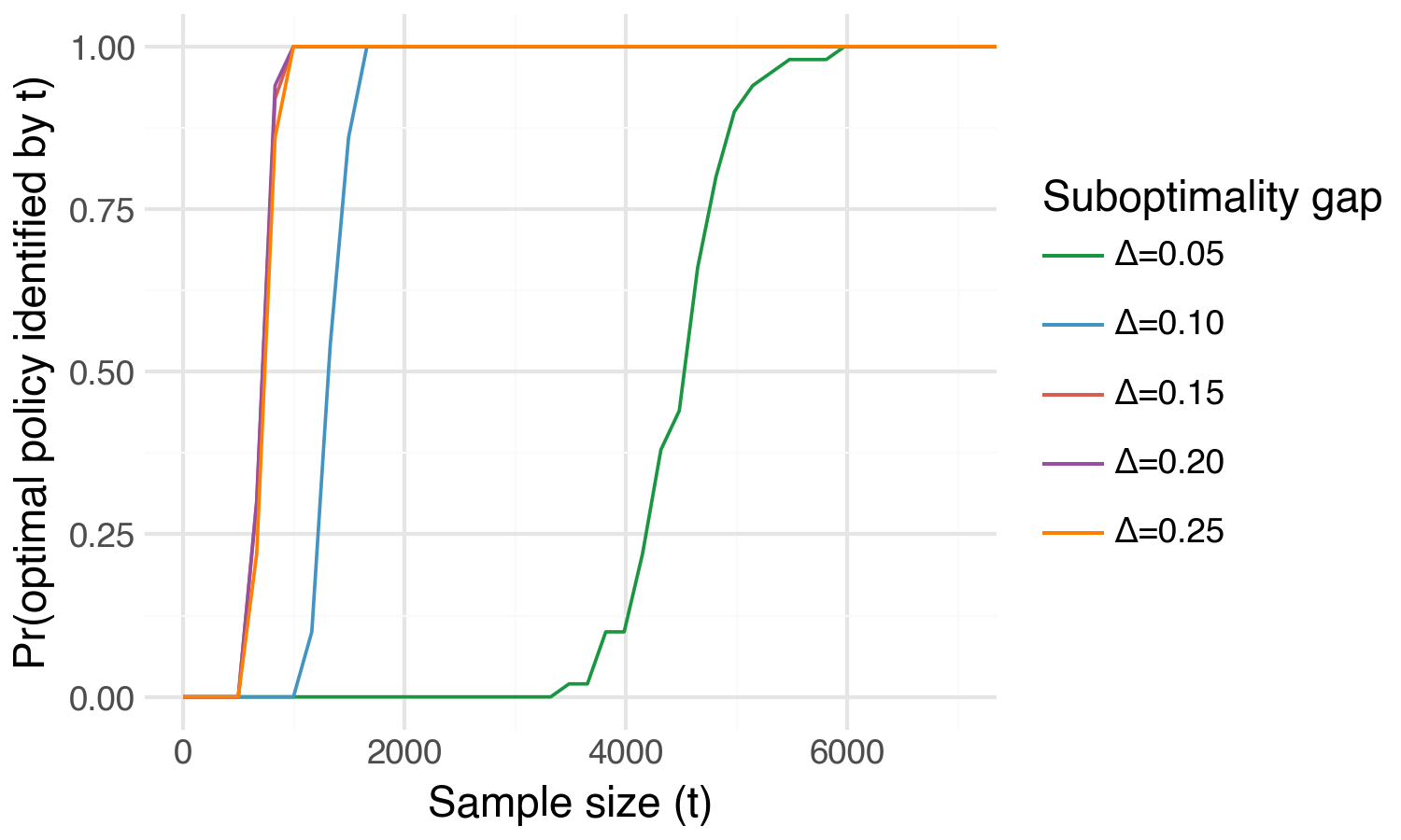 What it shows: How the stopping time \(\tau\) scales with the suboptimality gap \(\Delta_{\min}\) and the size of our policy class \(m\). As expected, we see that the sample size required to uniquely identify \(\pi^*\) decreases across both \(\Delta_{\min}\) and \(m\).