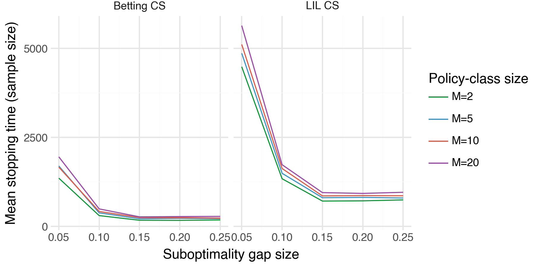 What it shows: How sample size needed to identify \(\pi^*\) scales with the policy class size \(m\). We plot the mean sample size across a grid of \(m\) values. As implied by the sample complexity bound in Theorem 1, we see that sample size increases in \(m\), but at a rapidly decreasing rate.
